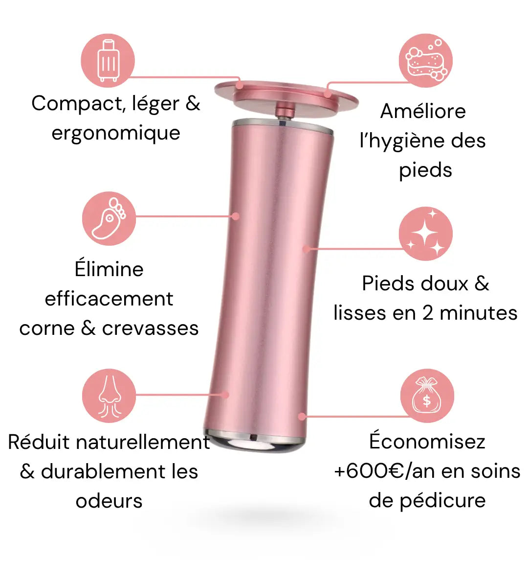 Un outil électronique de pédicure ⚡ (alliage d’aluminium, design rose) qui élimine sans douleur peaux mortes, callosités et talons secs. 600 tr/min, poignée ergonomique, branché sur secteur : pas de batterie à gérer.
